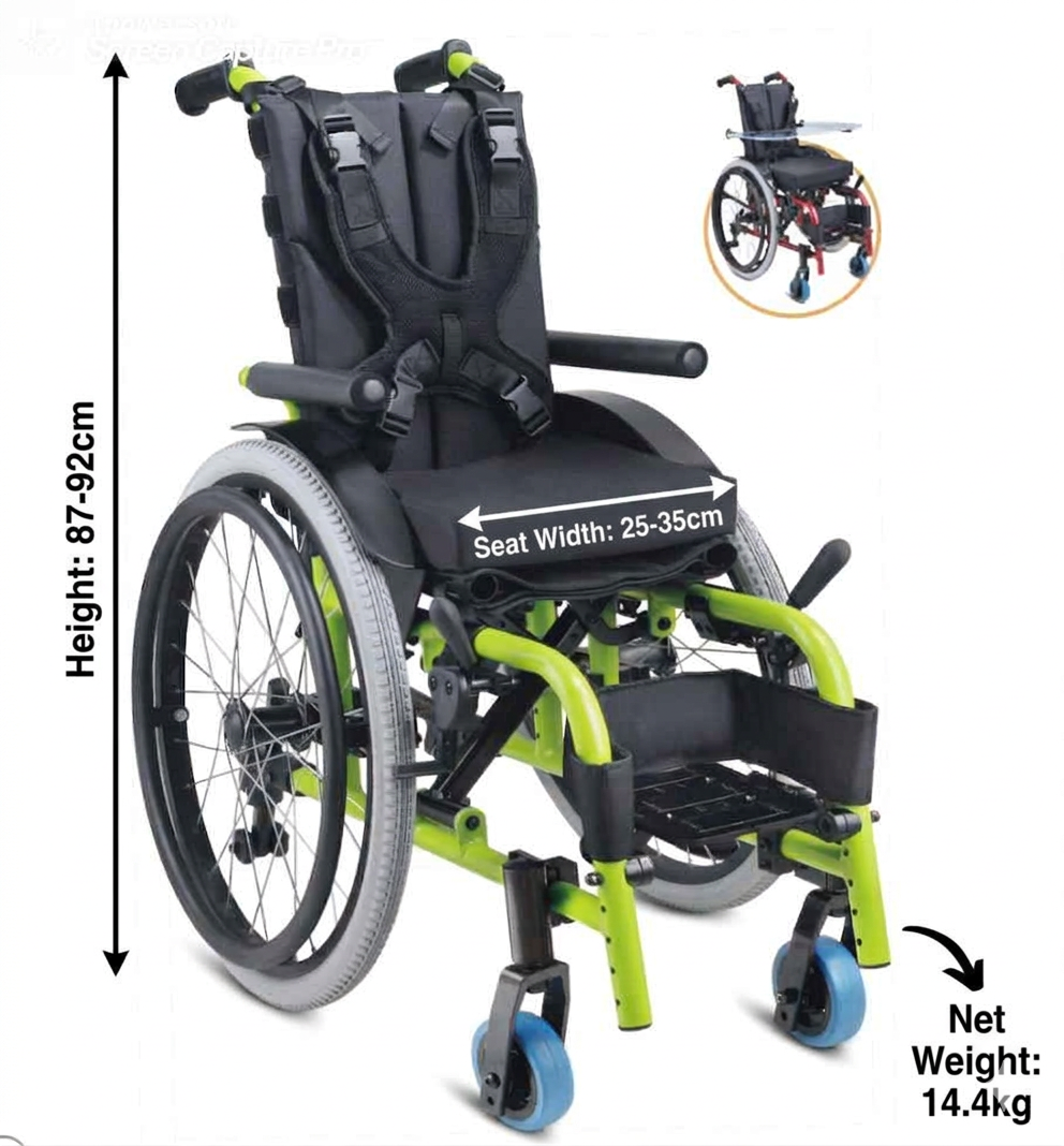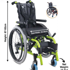 This model is a lightweight, foldable pediatric manual wheelchair designed for children with limited mobility. It features a sturdy aluminum frame, adjustable seat sizes, safety harness, fixed footrests, and quick-release pneumatic tires. It is ideal for pediatric postural support. This wheelchair is commonly used for kids needing adjustable support and easy portability for caregivers.