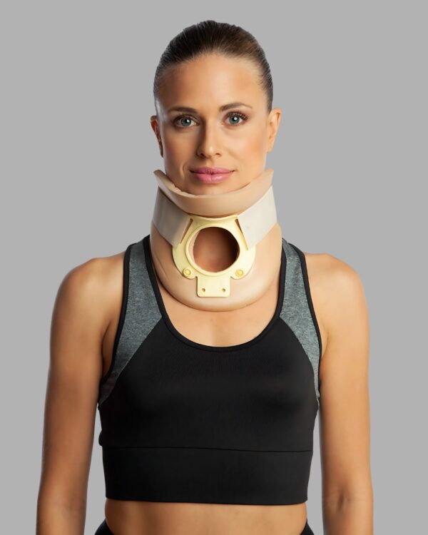 The Cervical Collar – Open is a specialized rigid neck brace designed to provide complete restriction in neck movements. It is particularly suited for severe neck traumas and cervical disc herniation where robust immobilization is critical, and where a tracheostomy may be present or anticipated. This orthosis offers significant stabilization for cervical spine fractures, effectively relieves pain from muscle strains, and supports a weakened or injured neck to aid in overall pain relief. A key feature is the prominent opening at the front, specifically designed to accommodate a tracheostomy or facilitate access for medical procedures without compromising cervical stability.