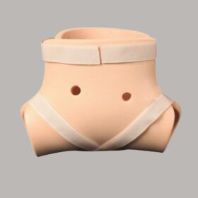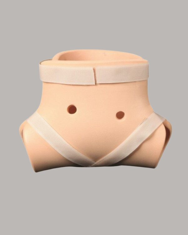 The Frejka orthosis is applied to the infant’s lower body, covering the pelvic and hip areas. The device features a central pelvic pad and adjustable straps that wrap around the thighs. It is designed to keep the hips in a flexed (bent) and abducted (spread apart) position, which is the most stable position for the hip joint. The straps are secured with hook-and-loop (Velcro-style) fasteners, and should be adjusted by a healthcare professional to ensure the hips are in the correct position for treatment. The orthosis is typically worn continuously to be effective.