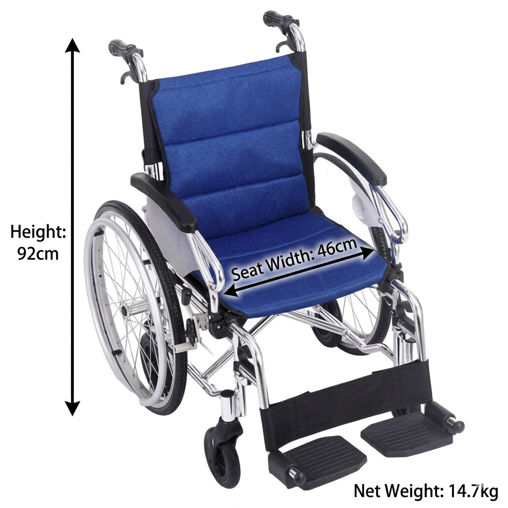 The Wheelchair Aluminum (Comfortable) is a lightweight, manual wheelchair featuring a durable aviation titanium aluminum alloy frame with a high-load bearing, double l-shaped support structure. Designed for portability, it includes quick-release 22-inch PU rear wheels and 6-inch plastic front wheels, along with 8-inch auxiliary wheels. This model is intended to provide increased mobility and independence for users requiring a durable yet light mobility device.